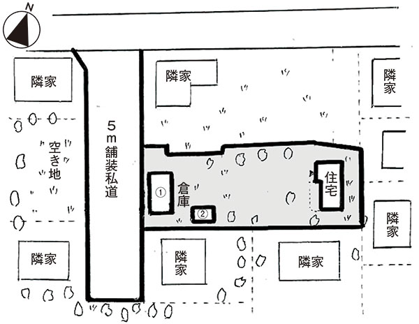 | 接道状況 | 西側が幅約5mの舗装私道に接する。 |
