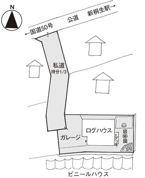 北関東外環を走る国道50号線沿いは、その交通量の多さから商業施設が賑わいを見せる地域で、車社会の桐生市では国道近くの宅地は根強い人気を誇っている。そんな国道から少し離れた農村風景が広がる閑静な環境で、近年宅地分譲が行われた新しい分譲地に佇むログハウスが今回の物件。建物はまだ築3年の真新しいおしゃれな外観で、車高に余裕のある電動シャッターのガレージと、天井まで吹き抜けの開放感のある室内、一目を気にせずくつろげるデッキ付きの庭園スペースが自慢だ。駅・買い物・教育施設・病院等も徒歩圏内に点在し、アクセスの良さと閑静な環境を求める方にはぴったりの物件だ。