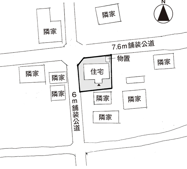 | 接道状況 | 西側が幅約6mの舗装公道に接する。北側が幅約7.6mの舗装公道に接する。 |