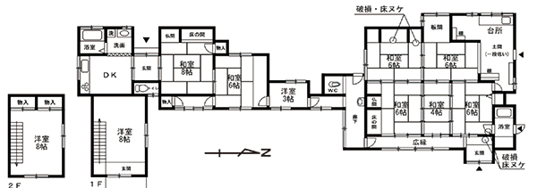 一級河川三篠川は広島市中心部へ流れる太田川の支流で、高低差も少ないため穏やかな川として親しまれている。そんな三篠川の土手近くにあるのが今回の物件で、南北に並列に4棟建物が並んでいるが、うち2棟は通り抜けが出来る構造のため、間取りは10DKととても広い。南側の平家建がメインの居住スペースで、水回り等もリフォームされているため快適に生活できる。北側の平家建は内外装ともに経年劣化が進行しているため、解体し更地後は駐車場等に転用した方が良いだろう。その隣の古民家は1階2階ともに物置小屋として使っているため、収納スペースにはかなりゆとりがあって使いやすそうだ。