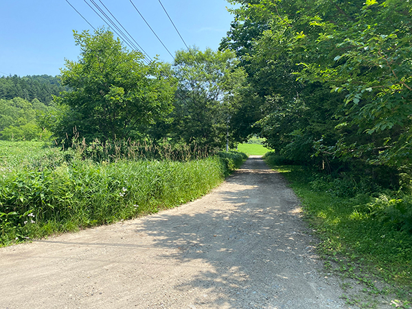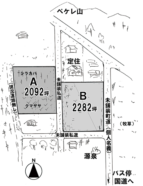 | 接道状況 | 南・西側が幅約8mの未舗装私道、東側が未舗装公道(登記は個人所有)に接する。 |