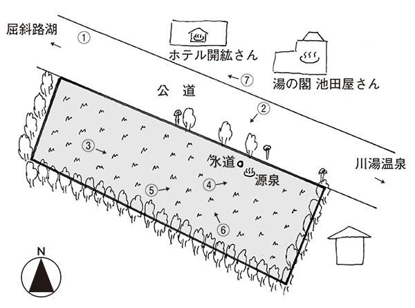 川湯温泉は活火山である硫黄山(アトサヌプリ)を源とした酸性硫黄泉で、日本有数の湯治場として全国各地から観光客が訪れており、町内では摩周湖・屈斜路湖と並ぶ一大観光地だ。星野リゾートが2028年に開業を目指している温泉旅館建設予定地より屈斜路湖方面へ進むこと約200m、県道沿いの平坦地が今回の物件。かつて温泉旅館が数棟建っていた場所で、温泉の源泉は地下8mほど掘削すれば湧き出る環境。歩いてすぐの場所には、温泉が流れる湯の川や足湯、共同浴場といった温泉巡りに適したスポットが集結している。屈斜路湖畔も車で約2分の立地のため、宿泊施設建設用地等にも向いているだろう。