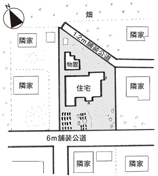 | 接道状況 | 南側が幅約6m、北東側が幅約1.2mの舗装公道に接する。 |