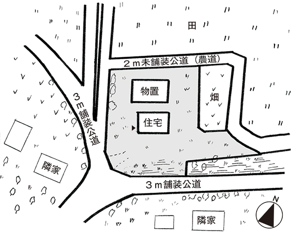 | 接道状況 | 南、西側が幅約3mの舗装、北側が約2mの未舗装公道(農道)に接する。 |
