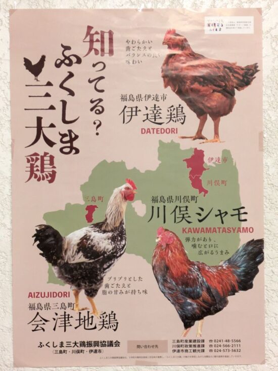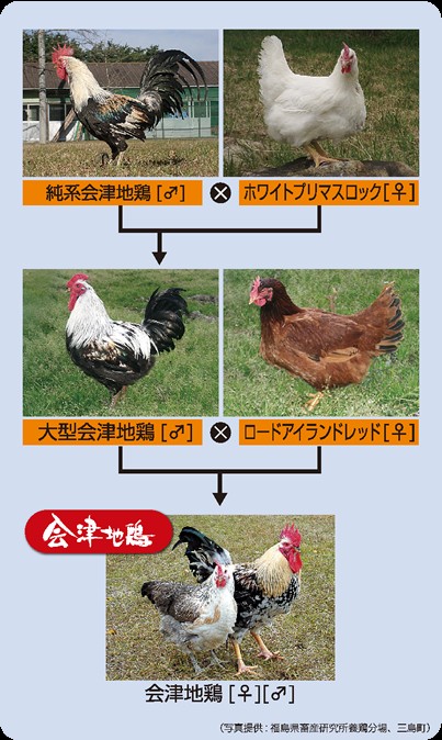 現在県で普及している「会津地鶏」は、県養鶏試験場で改良されたもので、純粋種よりも大型で肉質もよく産卵能力も向上しています。